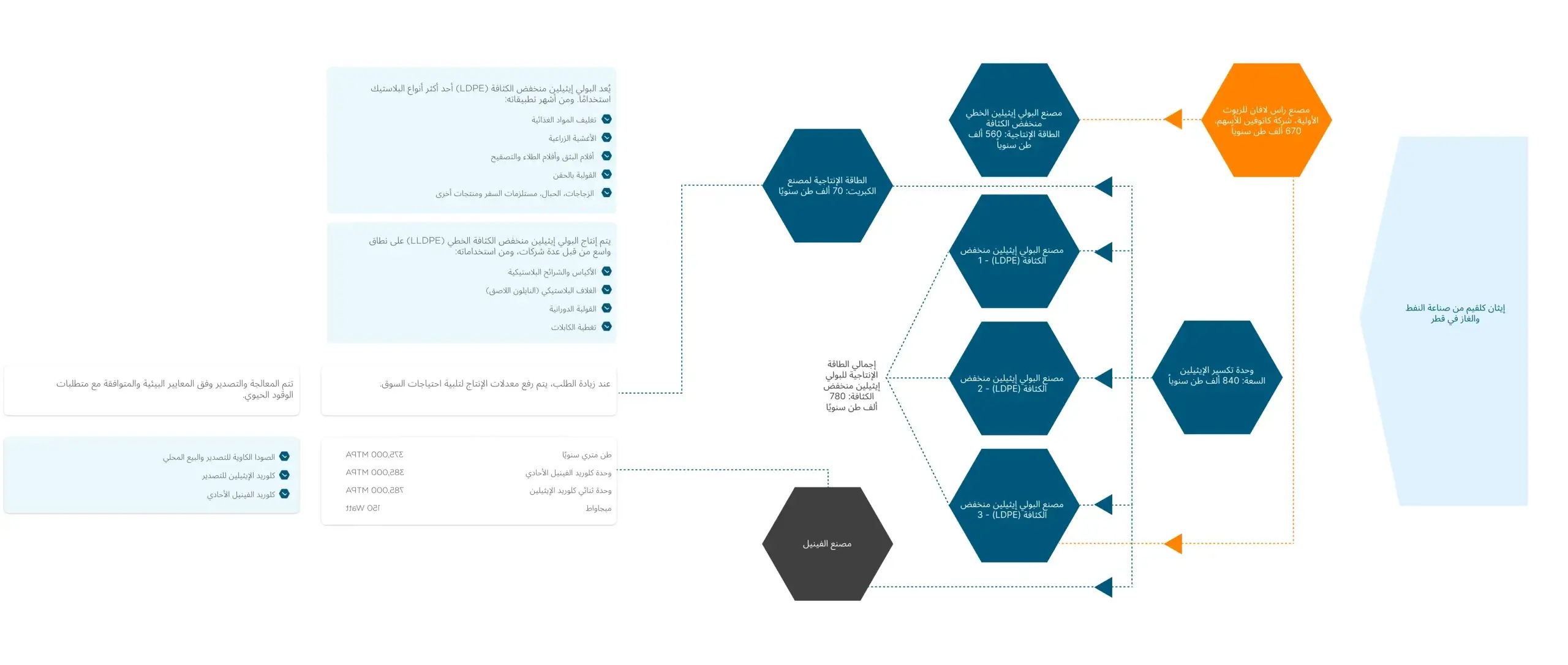 إننا نقوم بتحويل الإيثلين إلى بولي إيثلين وهو منتج له آلاف الاستخدامات ويساعد في تحسين جودة الحياة للملايين عبر عدة طرق لا حصر لها. وعلى وجه الخصوص، تنتج شركة قابكو البولي إيثلين منخفض الكثافة والبولي إيثلين منخفض الكثافة الخطي من خلال شركتها التابعة قاتوفين. وبعد ذلك، تُنتج قابكو- بالتعاون مع شركة قطر للفينيل- الصودا الكاوية وثاني كلوريد الإيثيلين (EDC) ومونومر كلوريد الفينيل (VCM) ومحلول حمض الهيدروكلوريك، بالإضافة إلى بولي كلوريد الفينيل (PVC).